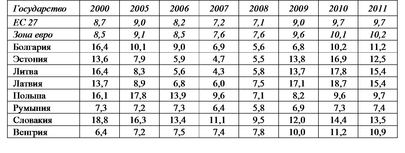 В предкризисный период ситуация на рынке труда в ЕС 27, также как и в сфере евро, улучшилась: в 2000–2008 гг. постоянно росла занятость. Безработица в первой половине 2000-х годов несколько выросла, но потом значительно снизилась. 2008 год был в этом отношении наиболее благоприятным. Позднее, в связи с глобальным кризисом, наступило существенное ухудшение: уровень занятости в ЕС 27 в 2010 г. был ниже, чем в 2008 г. на 1,7%, а уровень безработицы – выше на 2,6%. В 2011 г. произошел небольшой рост занятости, безработица сохранялась на высоком уровне, а в 2012 г. ситуация вновь ухудшилась. В целом число безработных во всем Евросоюзе выросло с 16 601 тыс. человек в 2008 г. до 25 254 тыс. – в июле 2012 г., что означало огромные потери в потенциальном ВВП [14].