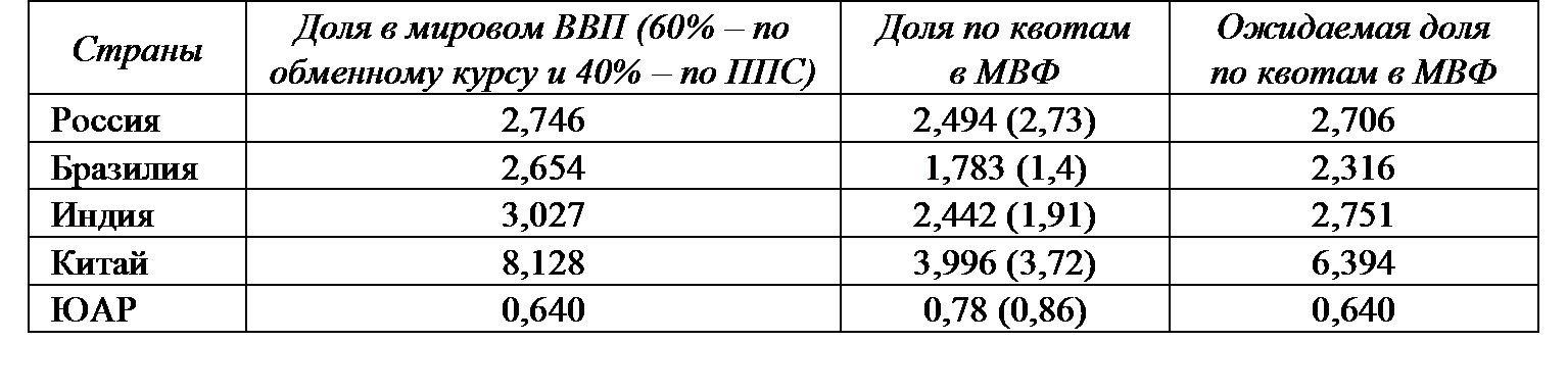 У стран БРИКС сформировалась общая позиция по ряду вопросов реформирования МВФС, прежде всего по реформе квот МВФ. Но даже маловероятная реализация предложения стран БРИКС по определению страновых квот на основе доли в мировом ВВП, причем рассчитанному на основе только ППС, мало что даст России.