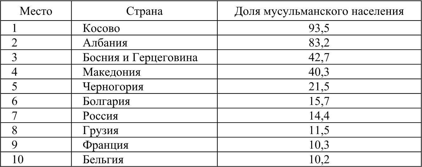 Допуская, что достоверной статистики мусульман в европейских странах также может и не быть, тем не менее, при оценке суммарной численности мусульманского населения Европы (включая Россию), сложившейся к концу первой декады XX столетия, мы будем оперировать цифрой в 44,1 млн, согласно опубликованным в 2011 г. данным «Пью». Как прогнозируют демографы того же института, к 2030 г. эта численность увеличится до 58,2 млн, доведя долю мусульманского населения в пределах европейского пространства с имеющихся 6 до 8% 28 . К рубежу третьей декады мусульмане превзойдут 10%-ный порог от общей численности населения в десяти странах на территории Европы (см. табл. 1).