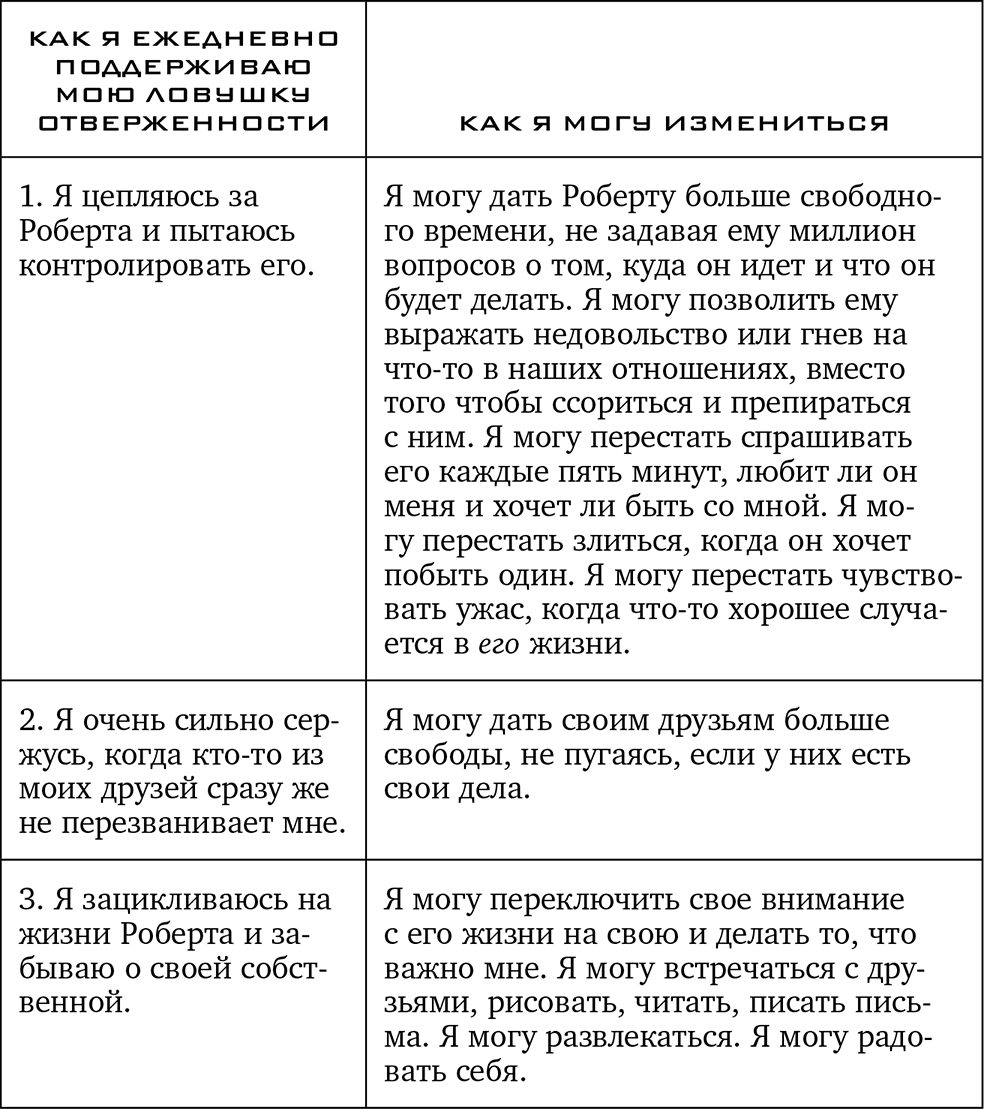 Для начала Даниэль попыталась изменить свое поведение с друзьями – перестала то приставать к ним, то злиться. Если они не перезванивали или не отвечали на приглашение, она ждала некоторое время и звонила снова, вместо того чтобы тут же перезванивать и срываться или расстраиваться. Она также стала больше общаться со своими верными друзьями и меньше – с теми, кто не был ей близок. Она решила разорвать отношения с особенно нестабильными людьми (в основном алкоголиками). Это была потеря, но зато решение принимала она.