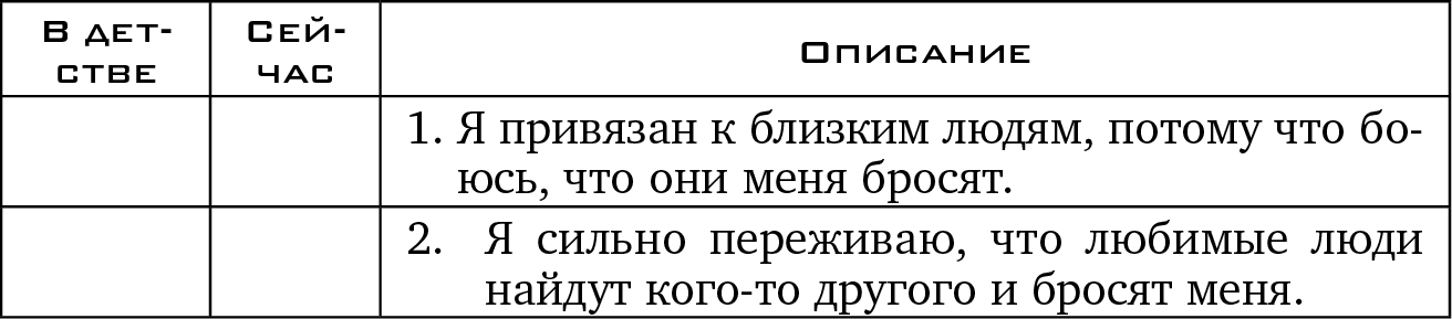 Вопросы 1 и 2 относятся к ловушке Отверженности. Давайте посмотрим на первый вопрос. Возьмите свою оценку этого пункта в детстве и перенесите ее в поле справа от слова ОТВЕРЖЕННОСТЬ на бланке, рядом с номером 1 (в колонку «Ребенок»). Теперь возьмите свой результат сейчас (во взрослом возрасте) и перенесите его в соседнее поле 1 (в колонку «Сейчас»).