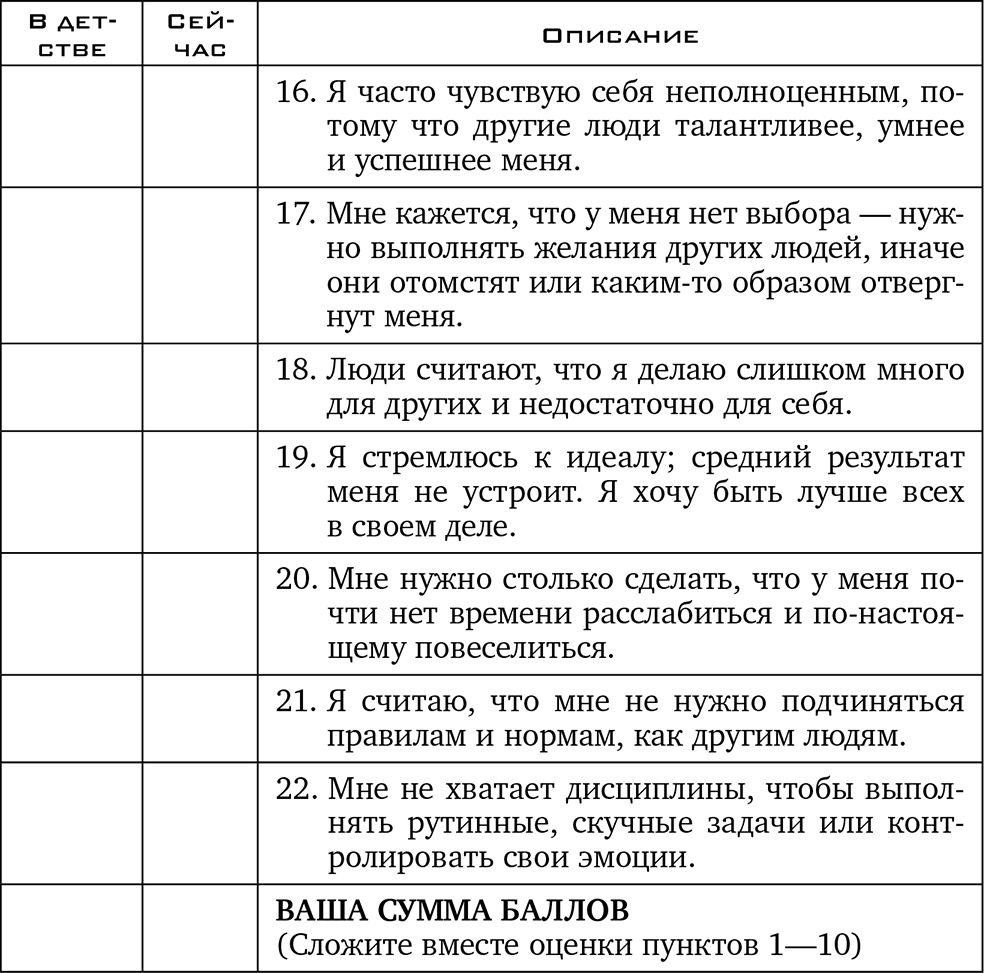 Вначале оцените, насколько точно это утверждение описывает вас, когда вы были ребенком. Если в разные моменты детства вы ответили бы по-разному, выберите значение, которое больше подходит для возраста до двенадцати лет. Затем оцените, насколько они верны для вас сейчас, во взрослом возрасте. Если в разные периоды вашей жизни ответ был бы разным, поставьте оценку в соответствии со своими чувствами в последние полгода.