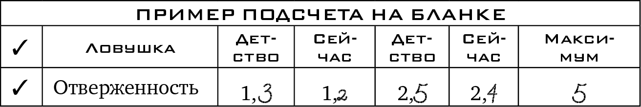 Если вы не уверены, применима ли ловушка к вам или вашим близким, не пытайтесь выяснить это прямо сейчас. В главах, посвященных конкретным ловушкам, мы даем более подробный тест, который вы сможете пройти, чтобы проверить, что относится именно к вам.
