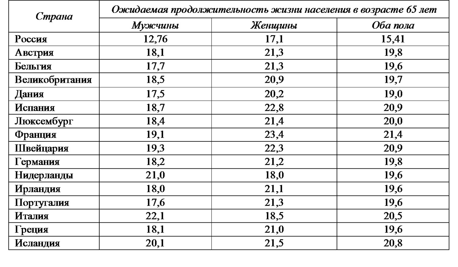 Принимая во внимание позитивные тенденции роста продолжительности жизни населения, некоторые экономисты предрекают необходимость незамедлительного повышения пенсионного возраста в целях сокращения объема трансфертов федерального бюджета бюджету ПФР. Напомню, что действующий порог общеустановленного пенсионного возраста – 55 лет для женщин и 60 лет для мужчин – впервые был введен Постановлением ВЦИК СНК РСФСР от 26.08.1929 г., когда ожидаемая продолжительность жизни мужчин в возрасте 60 лет составляла 14,5 лет, женщин, достигших возраста 55 лет, – 20,7 лет. Следует обратить внимание, что рост этого показателя за прошедшие 86 лет существенно отстает от среднеевропейских показателей. Так, например, за последний полувековой период в странах Европы ОПЖ увеличилась на 150%, в то время как в России – на 110%.