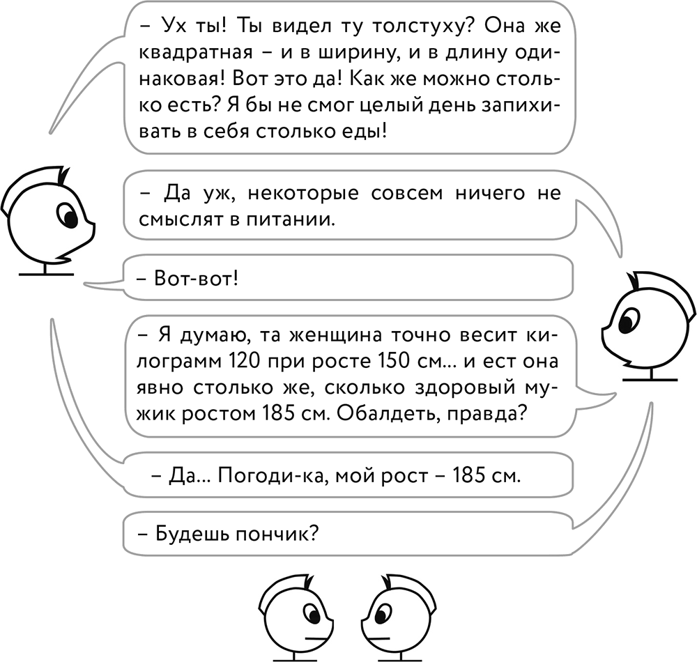 Я думаю, что именно ошибочное представление о пищевом поведении (очень) толстых людей приводит к тому, что многие считают себя другими и говорят: «Это не мой случай, ведь я не питаюсь так, как типичные толстяки!». На самом деле, вряд ли вообще существуют типичные толстяки. Если бы вы видели, как по утрам я уплетала булочки с тыквенными семечками и сыром (около 400 ккал), в полдень – салат, о котором рассказывала ранее (около 1500 ккал), а в течение дня жевала «Студенческую смесь» – орешки с сухофруктами (около 1000 ккал), то вы бы наверняка сказали мне, что мое пищевое поведение чересчур экстремальное. Хотя у многих сложилось бы впечатление, что мое ежедневное питание было не чрезмерным и вообще вполне здоровым, ведь я ела цельнозерновой хлеб, салат и орехи. До тех пор пока жировая ткань не начнет заявлять о себе и оказывать пагубное воздействие на организм, восприятие пищевого поведения не проясняется.