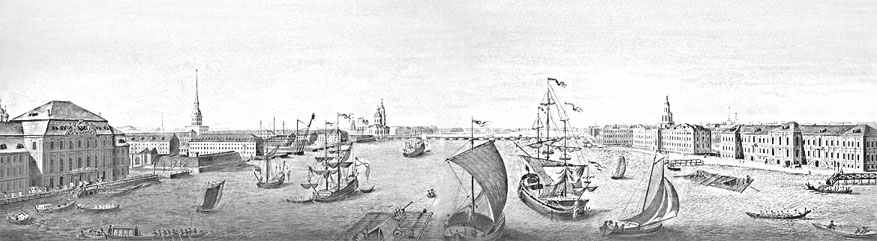 Проспект вниз по Неве реке между Адмиралтейством и Академией наук. Раскрашенная гравюра по рис. М.И. Махаева. 1753 г. Слева вниз по течению показаны: здание 4-го Зимнего дворца; комплекс Адмиралтейства; церковь Св. Исаакия Далматского. Справа вниз по течению показаны: здание Академии наук (бывший дворец Прасковьи Федоровны); здание Кунсткамеры; комплекс зданий Двенадцати коллегий (Университет). В глубине виден наплавной Исаакиевский мост через Неву
