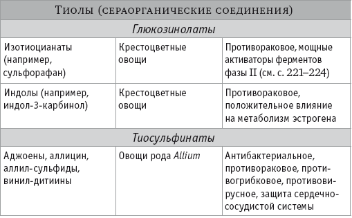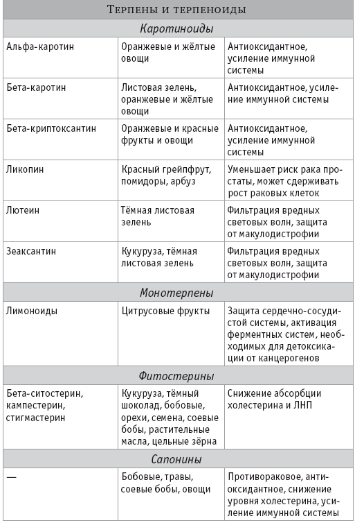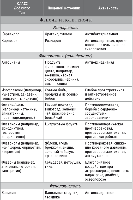 В эту таблицу включены три основных класса фитохимических веществ: фенолы и полифенолы, терпены и терпеноиды, а также тиолы (сераорганические соединения). Представители каждого класса схожи по своей химической структуре. Фенолы и полифенолы – большой и впечатляющий класс фитохимических веществ, характеризующихся антиоксидантным и противовоспалительным действием. Некоторые из этих веществ также замедляют формирование и рост опухолей и ослабляют факторы риска, связанные с заболеваниями сердца и инсультом. К терпенам относятся тысячи типов соединений с разнообразными положительными свойствами, связанными со снижением риска заболеваний сердца и рака. Самый важный подкласс терпенов – это каротиноиды. Тиолы – это серосодержащие фитохимические вещества, часто обладающие довольно выраженным ароматом. Известно, что многие из этих соединений стимулируют ферментные системы, которые могут способствовать уменьшению повреждений ДНК. Они также обладают признанными противовирусными, антибактериальными и противогрибковыми свойствами и защищают сердечно-сосудистую систему. Некоторые тиолы играют роль фитоэстрогенов7, 8.