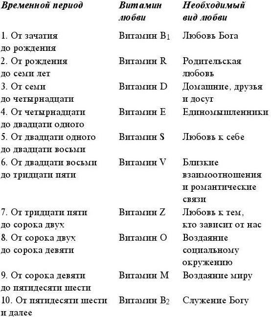 Вплоть до достижения полной зрелости (в 56 лет) нам важно получать для своего роста витамины любви, соответствующие определенному периоду жизни. Если мы недополучаем тот вид любви, в котором нуждаемся, так или иначе это нам вредит. Проходя через определенные стадии развития, мы будем в той или иной мере что-то упускать.