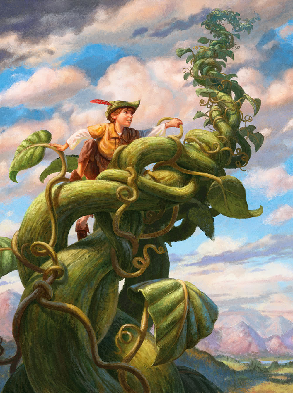 Чем выше он забирался, тем больше видел вокруг. Джек вскарабкался так высоко, что перед ним раскинулось всё королевство и даже соседние земли. Когда он добрался до облаков, его собственный дом превратился лишь в крохотное пятнышко далеко внизу, и криков матери Джек уже не слышал. Он зачерпнул ладонью облака и с радостью обнаружил, что они мягкие и пушистые, как он всегда и думал.