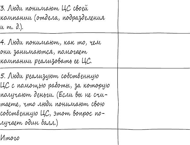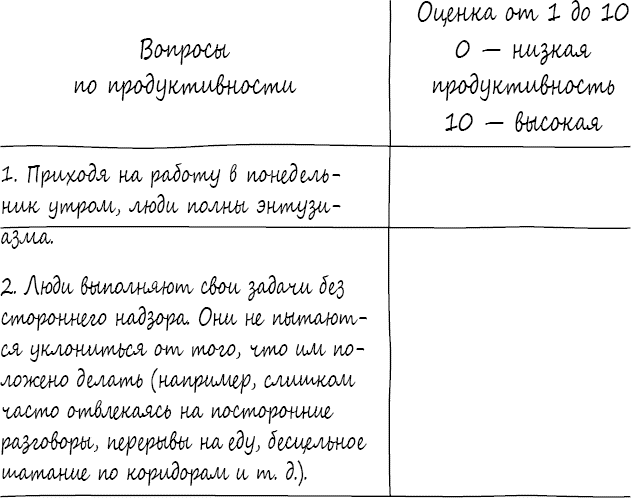 – Итак, – сказал я и протянул ей листок. – Заполните эту форму. Один балл – низшая оценка на шкале, десять – высшая. Так, например, в первом вопросе – «Приходя на работу в понедельник утром, люди полны энтузиазма» – единица будет указывать на полное отсутствие энтузиазма, а десятка – на крайнее воодушевление. Потом подсчитайте общую сумму в конце и умножьте на два. Это дает нам легкий способ вычислить продуктивность по шкале от одного до ста.