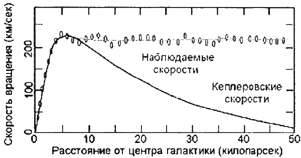 А недавно обнаружились и другие несоответствия ТЭ наблюдаемым явлениям, которые невозможно было оставить без внимания. Согласно расчетам, скорость обращения звёзд вокруг центров галактик должна уменьшаться по мере увеличения расстояния от него. Но наблюдения показали, что звёзды, расположенные близко к центру, подчиняются этой закономерности, а более удалённые – нет (рис. 1). Расхождение расчётов с наблюдениями происходит не на какие-то проценты, а в разы. При таких скоростях вращения периферийных тел центробежные силы должны были бы разрывать галактики, но этого не происходит. Теоретики придумали простое объяснение этому несоответствию. Они предположили, что пустое пространство между звёздами заполняет некая невидимая «тёмная материя», которая, кроме создания дополнительной гравитации, ничем другим себя не обнаруживает. Для того чтобы в расчётах сошлись концы с концами, масса этой «тёмной материи» во Вселенной должна превышать массу всего прочего вещества в 5 раз.