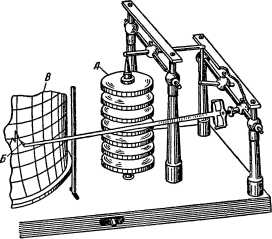 В этом приборе расширение и сжатие металлических коробочек А передаётся не на стрелку, а на самопишущее перо Б, которое записывает величину давления на бумажной ленте В, охватывающей барабан, который вращается часовым механизмом.