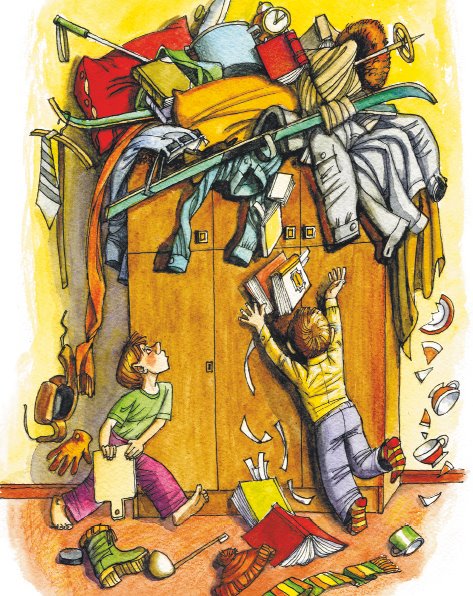 Тогда мы на шкаф закинули ещё три подушки, мамино пальто, все мамины платья, папины лыжи, кастрюльку, папины и мамины домашние туфли, много книг и ещё много всего. А кошка оттуда не прыгнула.