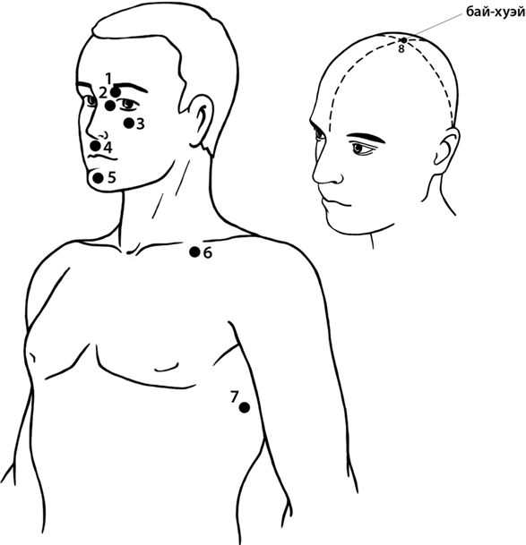 Точка 1 – на внутренних краях бровей. Уверенно барабаним по костям глазниц с усилием, приблизительно равным печатанию на пишущей машинке (чуть более интенсивно, чем на клавиатуре компьютера).