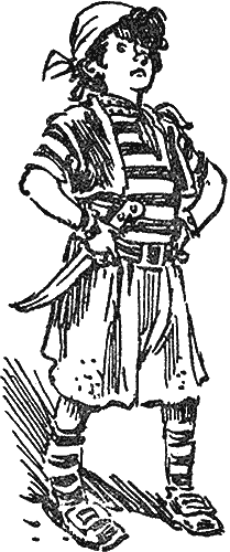 Пиратский корабль привалился бортом к «Пиносу». Алиса разглядела рулевого пиратского корабля — мальчишку чуть постарше ее самой. Черные курчавые волосы были схвачены красным платком, на ногах — красные штаны до колен, подвязанные широким золотым ремнем, за который был засунут кинжал.