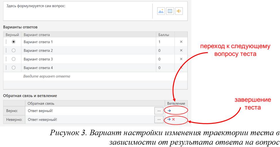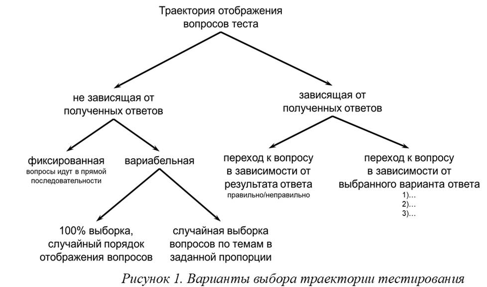 Траектория тестирования может изменяться в зависимости от результата ответа на вопрос, в том числе – приводить к досрочному завершению теста.