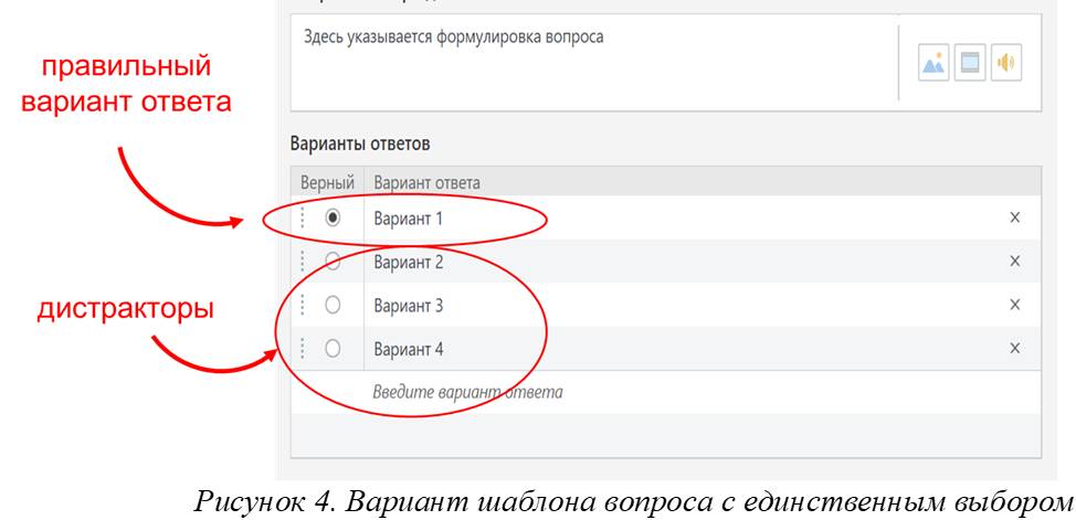 При формулировании вопроса не забудьте указать на необходимость выбора одного варианта ответа. Пример настроек шаблона вопроса с единственным выбором в специализированном средстве разработки представлен на рисунке 4.