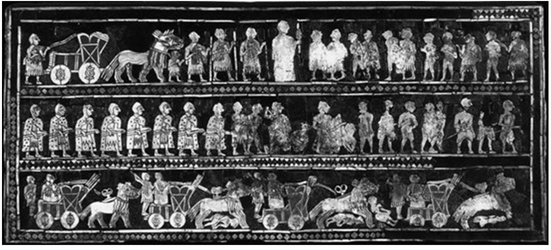 Первыми применили колесницы в бою шумеры. На так называемом «Штандарте из Ура» прекрасно видно, что шумерские «колесницы» были двуосные, запряженные низкорослыми лошадьми. Спереди у этой колесницы-телеги крепился щит, за которым прятался экипаж из двух человек: возничего, управлявшего упряжкой из четырех лошадей и воина, метавшего в противника дротики. Колеса у этих повозок не имели спиц, она была маломаневренной и не могла развивать высокую скорость. Применялась как таран для прорыва рядов вражеской пехоты.