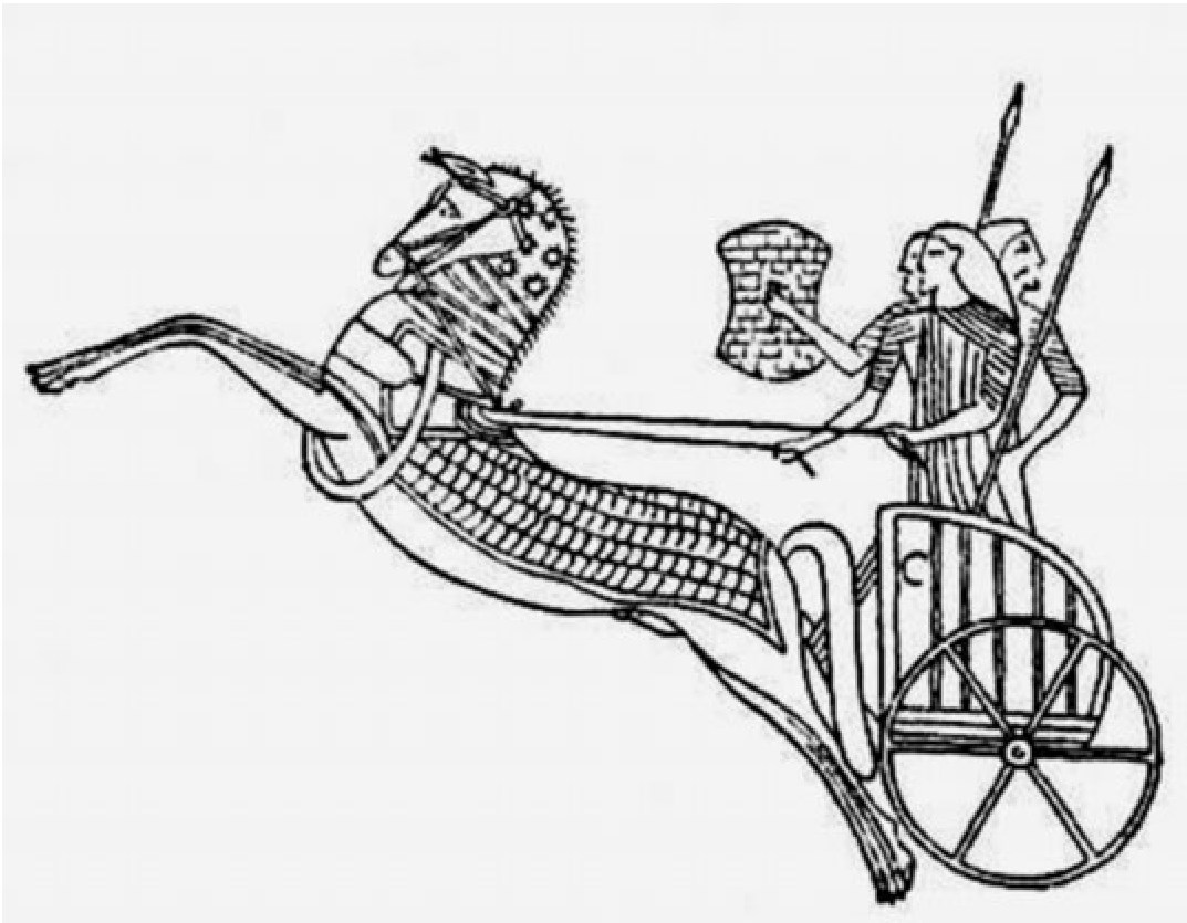 Хеттская колесница: возничий, щитоносец, тяжеловооруженный воин. Кони покрыты доспехом