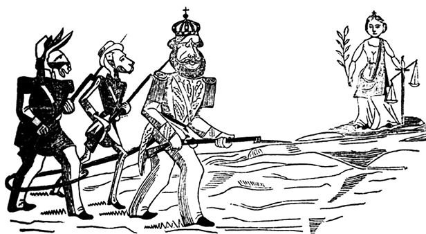 Парагвайская газетная карикатура на Тройственный альянс. Члены антипарагвайской коалиции изображены в виде антропоморфных животных: Бразилия – лев, которому художник придал портретное сходство с императором Педро, Уругвай – обезьяна, а Аргентина – осел. Главенствующее положение Бразилии в альянсе показано тем, что лев идет впереди и удерживает компаньонов своим хвостом. Справа нарисована аллегория справедливости и юстиции
