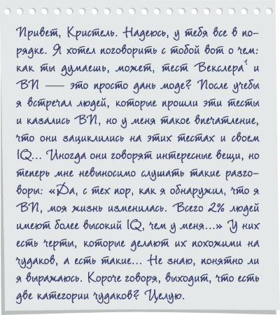 Хотя тест на IQ местами полезен, эти тесты имеют некоторые недостатки: они очень дорогостоящие, их надежность довольно сомнительна и может даже требовать доказательств. Поскольку они намеренно стандартизированы, чтобы относиться только к 2 % населения, множество особенных детей под эти критерии не подходят. В своей книге «Я слишком много думаю» тестам на IQ я посвящаю целую главу. Если вы хотите глубже погрузиться в эту тему, предлагаю вам ее прочитать.