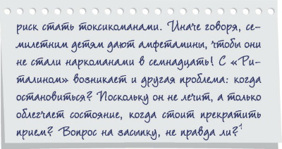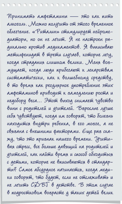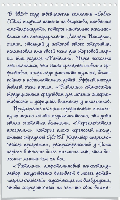 Аббревиатура СДВГ означает «Синдром дефицита внимания и гиперактивности». В мире раздается все больше голосов, заявляющих, что такого расстройства не существует. Так, в своей книге «Мы все гиперактивны?»5 французский психиатр Патрик Ландман (Patrick Landman) говорит об «эпидемии гиперактивности». По его словам, это расстройство является искусственным конструктом6, предназначенным для обогащения лабораторий. Цифры действительно говорят сами за себя: в США торговый оборот лекарств, борющихся с СДВГ, 20 лет назад превышал 40 миллионов долларов, а сегодня – 10 миллиардов. Ландман говорит о «маркетинге психических заболеваний, которые продаются, как продукты питания». Этот феномен возник в США, но распространился по всему миру.