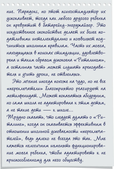 Д-р Доминик Дюпань также отходит от медицинских критериев, определяющих СДВГ7. Он предпочитает говорить о «переключателе телепрограмм». По его словам, «характер человека, щелкающего пультом телевизора, берет начало из доисторических времен. Такое импульсивное и интуитивное поведение – это поведение охотника или воина. „Переключатели и переключательницы программ“ скучают и хиреют среди земледельцев и их потомков, которые правят миром вот уже 10 тысяч лет. Их очень рано начинают притеснять в нашей образовательной системе, задуманной людьми спокойными, внимательными и терпеливыми».