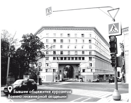 Дом общежития Военно-инженерной академии попал в качестве естественной декорации в несколько фильмов. Самый знаменитый из них – «Покровские ворота». Монументальные скульптуры рабочего и колхозницы перед аркой, ведущей во двор, дают повод для фантазии. Похоже, мужчина с отбойным молотком в одной руке и книгой в другой символизирует пролетария, грызущего гранит науки. А женщина с винтовкой в одной руке и снопом в другой символизирует колхозницу, которая собирает урожай, а потом стережёт закрома родины. Какой инструмент познания мира аллегорически изображён в виде отбойного молотка, остаётся загадкой.