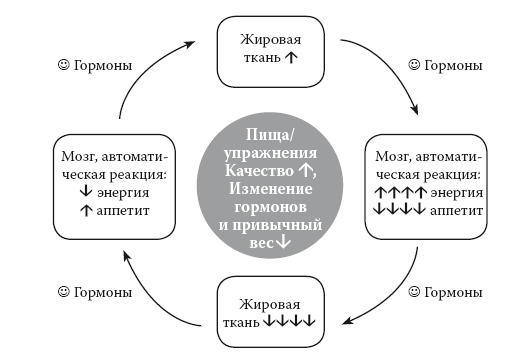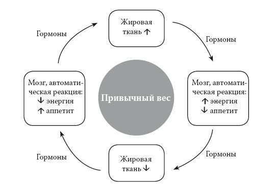Понятие привычного веса становится яснее, если провести аналогию между привычным весом и привычной температурой. Нормальная температура тела составляет 36,6 °C, однако если с организмом что-то не так – температура может повыситься. Повышенный стабильный вес и повышенную стабильную температуру можно на некоторое время принудительно сбить понижением уровня энергии (голоданием в случае с весом и ледяными ваннами в случае с температурой), но поскольку ни один из этих подходов не затрагивает истинную причину аномалии, то при долгом их применении они принесут больше вреда, чем пользы.