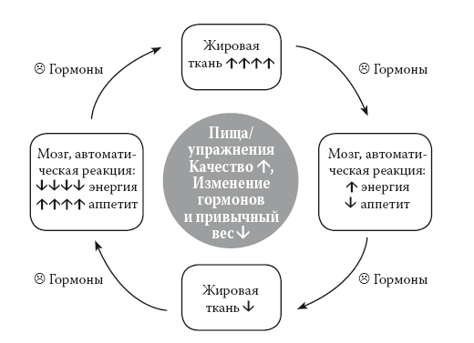 Вы, должно быть, думаете: «Все эти теории насчет привычного веса, конечно, хороши, но ведь люди и вправду худеют, когда мало едят и много занимаются спортом». Феномен привычного веса не отрицает того, что можно похудеть, если мало есть и много двигаться, и что можно прибавить в весе, если делать все наоборот. Отклонения от привычного веса, когда мы отступаем от здорового образа жизни, на короткое время вполне возможны. Как я заметил раньше, мы можем сидеть в ванне со льдом (сколько хватит терпения), и температура тела временно понизится, – точно так же мы можем голодать (сколько хватит силы воли), и мы временно похудеем. Однако для достижения долгосрочного результата феномен привычного веса оказывается намного пригоднее. С ним становится понятно, почему нам так сложно удержать вес, сниженный с помощью метода подсчета калорий. Разумеется, временного уменьшения веса можно достичь, изменив количество пищи и физической нагрузки, но на уровень привычного веса мы можем повлиять, только повысив качество пищи и физических упражнений. Чем выше качество, тем ниже привычный вес.