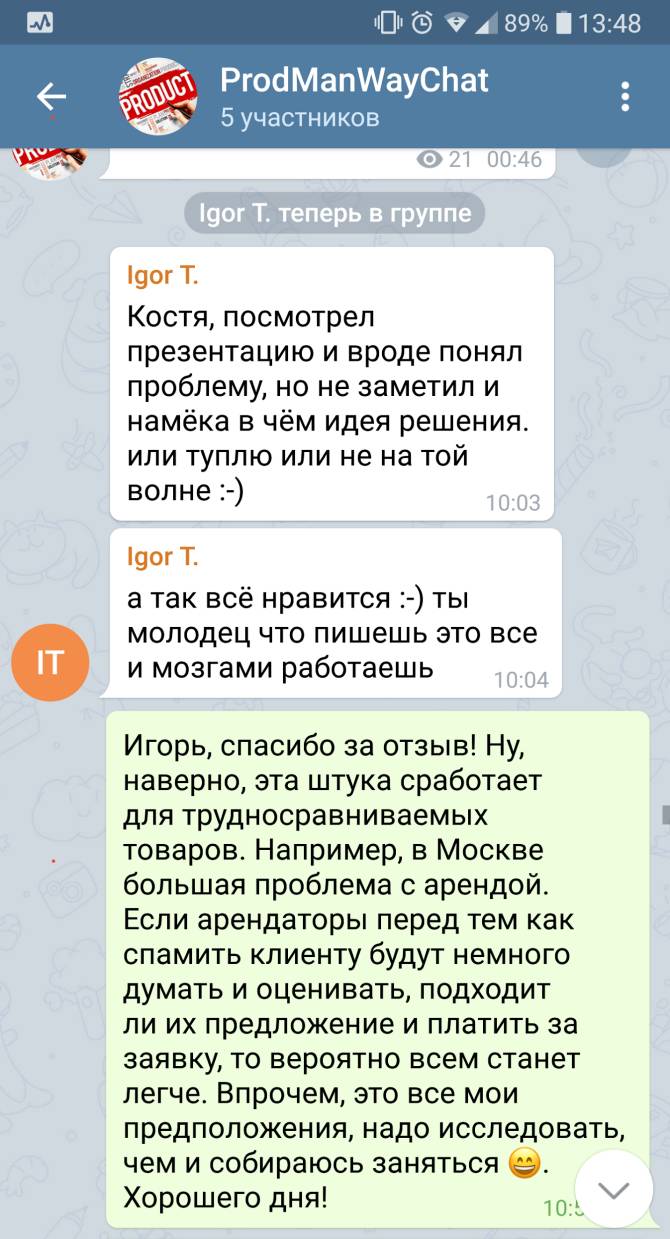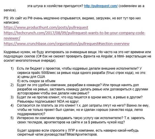 Насчет идеи УберКодревью (№71). Покастдевил в одной дружественной ИТ-компании (скрины далее). Я думал, что B2B проще. Если зашел в одну компанию, считай, жизнь удалась. А с B2C сплошной геморрой. Только привлек клиента (физика), как он уже отвалился и не факт, что стоимость его привлечения будет больше выручки с него. По хорошему, должно быть больше раза в 3. Но как выяснилось, с B2B все не так просто. Проблемы с приватностью данных клиента и подрядчика и интеллектуальной собственностью, даже при подписанных NDA. Кодревью сплачивает команду и улучшает код и вряд ли хорошие компании захотят иметь внешний кодревью. Это увеличивает стоимость контракта для клиента. Проблема этического толка – кто гарантирует, что внешний ревьюер не зачморит код команды и не перетянет проект в свою компанию? И прочая и прочая. В общем, выглядит круто, интересно, технологично, но если копать дальше, наверняка вылезут и другие проблемы. Хотя, конечно, все надо исследовать и проверять.