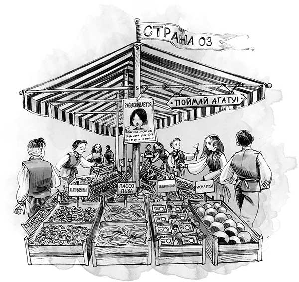 Поскольку Волшебник из страны Оз ежедневно соглашался принять всего нескольких посетителей, поиски Агаты превратились в азартную игру, в чем-то сродни золотой лихорадке. Предприимчивые торговцы немедленно отреагировали тем, что выбросили на прилавки новейшие товары – разумеется, самые что ни есть «волшебные». Какие именно, спросите вы? Ну, например, «Агатовизоры» – очки, якобы помогающие увидеть Агату. «Лассо Льва» – светящиеся веревочные петли, чтобы заарканить ее. «Тедросовик» – говорящий якобы голосом Тедроса приборчик, чтобы подманить Агату. А еще «Искалки» – шары из искусственного хрусталя, помогающие, как уверяли продавцы, искать Агату, и даже «волшебные» карты Гилликина с указанием мест, где она, вероятнее всего, может показаться.