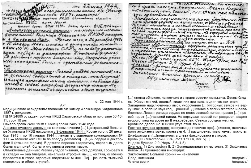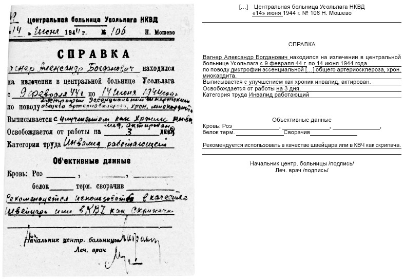 В июне 1944 года Александра выписали из Центральной больницы Усольлага НКВД «с улучшением». Категория труда – «инвалид работающий». Звучит как биологическое описание животного или насекомого. Прилагавшаяся к этому заключению рекомендация комиссии поразила меня своим цинизмом и полным отсутствием человечности: «Использовать в качестве швейцара или в КВЧ как скрипача».