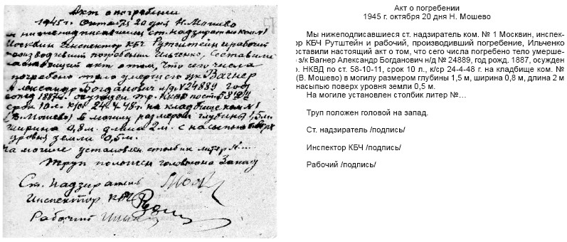 Дальше выводы медкомиссий становятся все безнадежнее, заключение последней: «больной хроник – неизлечим». 20 октября 1945 года в Усольлаге НКВД, ОЛП № I [14] , командировке № I [15] был составлен акт о смерти Александра Богдановича, а позже в тот же день в поселке Нижнее Мошево под Соликамском – акт о его погребении. Александра похоронили на кладбище командировки № 1 в поселке Верхнее Мошево, «в могилу размером глубина 1,5 метра, ширина 0,8 метра, длина 2 метра, с насыпью вверх от уровня земли 0,5 метра». Вот такая точность. Вместо номера могильного столбика в акте стоит многоточие.