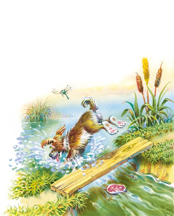 Собака шла по дощечке через речку, а в зубах несла мясо. Увидала она себя в воде и подумала, что там другая собака мясо несёт, – она бросила своё мясо и кинулась отнимать у той собаки: того мяса вовсе не было, а своё волною унесло. И осталась собака ни при чём.