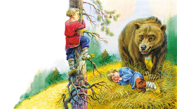 Шли по лесу два товарища, и выскочил на них медведь. Один бросился бежать, влез на дерево и спрятался, а другой остался на дороге. Делать было ему нечего – он упал наземь и притворился мёртвым.