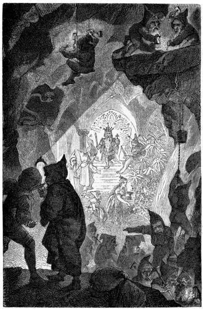 Сверкающие золотые жилы пронзали камень, из темных скал били родники, чьи чистые воды переливались и искрились, словно несли с собой зерна драгоценного и столь желанного металла. В темном гроте лежало что-то светлое и неподвижное, напоминающее дремлющего орла; но, проснувшись от света, подняло украшенную драгоценными камнями голову и оказалось змеиной королевой. Капли, стекавшие по стенам грота, сверкали, подобно драгоценным камням ее диадемы; но змея снова склонила голову и свернулась клубком, готовясь уснуть, ибо хорошо знала, что маленькие карлики, в отличие от жадных сынов человеческих, никогда не протянут руку, чтобы сорвать диадему с ее головы. У источника, на коленях, стояла темная фигура, деловито собиравшая золотой песок со дна и складывавшая его в сумку, лежавшую рядом; но кто она, разглядеть было невозможно, по причине падавшей на нее густой тени. Несколько трудолюбивых маленьких человечков приблизились к ней с мерцающими фонарями, человек у источника повернул голову и приветливо кивнул им, на что те ответили тем же, словно он был их старым и добрым другом.