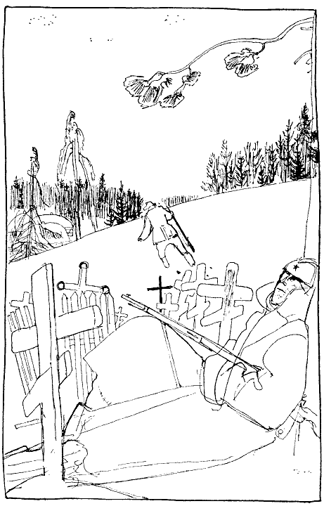 «Подождать — это хорошо, — подумал Сотников, — лишь бы не идти». Ждать он готов был долго, только бы дождаться чего-нибудь обнадеживающего. Рыбак устало поднялся на ноги, взял карабин. Чтобы тот не бросился в глаза, перехватил его, словно палку, за конец ствола и широко зашагал по заснеженным буграм могил. Сотников раскрыл глаза, повернувшись немного на бок, подобрал поближе винтовку. Между стволов сосен совсем недалеко была видна крайняя изба деревни, развалившийся сарай при ней; на старом, покосившемся тыне ветер трепал какую-то забытую тряпку.
