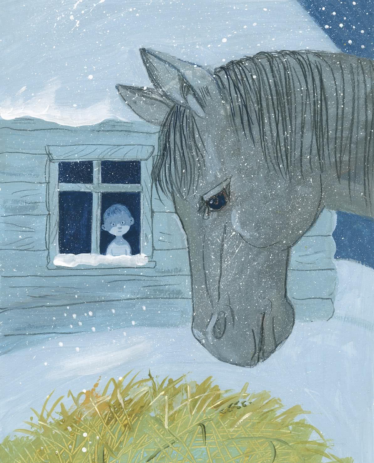 Но вот из-за быстрых туч стремительно выкатилась луна. Чёрно-синие сугробы засверкали мягким матовым блеском, и Гек увидел, что медведь этот вовсе не медведь, а просто это отвязавшаяся лошадь ходит вокруг саней и ест сено.
