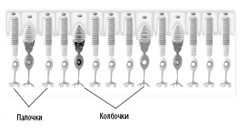 Палочки и колбочки заселяют наружные слои тонкой ткани специализированных клеток, которые называются сетчаткой. Палочки более многочисленны, особенно на краях сетчатки. В центре сетчатки больше колбочек.