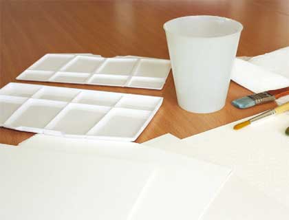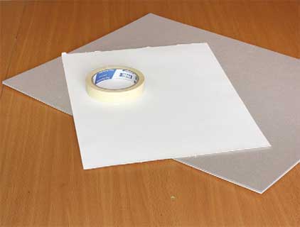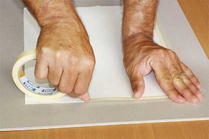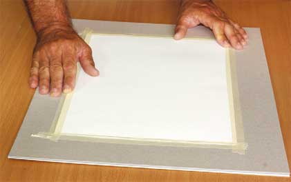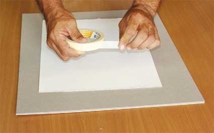 Ну вот, вроде со всеми основными материалами мы разобрались и теперь приступим к подготовке бумаги к работе. Если вы используете не альбом-склейку, а пишете на отдельных листах, то их нужно хорошо закрепить. Вы можете прикрепить лист кнопками к доске на мольберте или же сделать картонный или фанерный планшет. Для этого потребуется лист толстого картона, малярный скотч и лист акварельной бумаги. Для фиксации бумаги подходит только малярный скотч и никакой другой. Его можно удалить с работы, не повредив бумагу и красочный слой. Остальные же виды скотча пропитаны клеем и при удалении рвут бумагу. Обратите внимание на то, что лист картона по размеру должен быть больше, чем лист акварели.