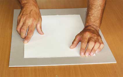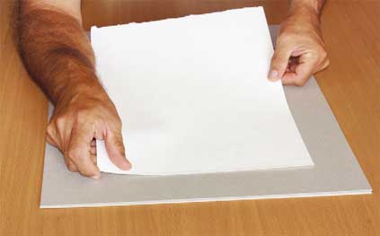 1. Расположите акварельный лист по центру картонки. Убедитесь, что лист лежит ровно и не выгибается. Если ранее акварельная бумага была свернута в рулон, то ее следует некоторое время подержать в развернутом виде и под прессом, например, из нескольких книг.