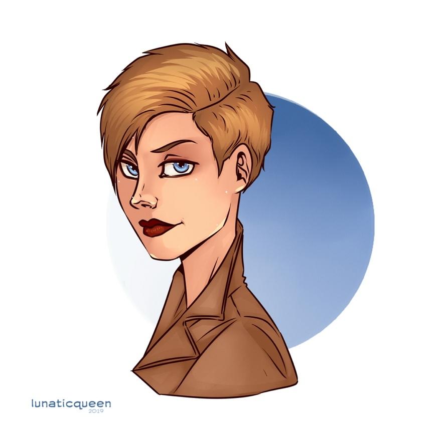 Кремовое полупальто, короткая стрижка с косой челкой на бок, темно-красные губы.