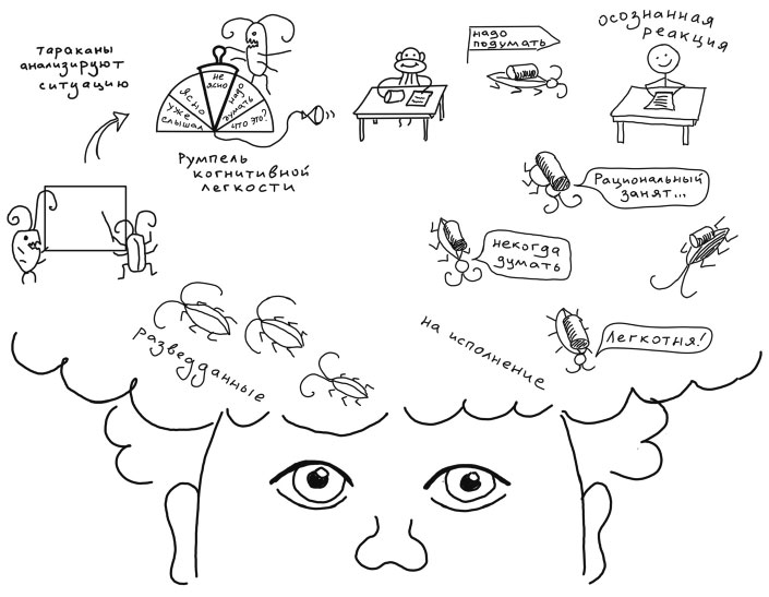 Если вы купились на этот трюк, это и было состояние когнитивной легкости – тараканы поняли, что задача простая, с размышлением можно не заморачиваться, просто говори первое, что приходит на ум, даже вопрос до конца дослушивать не обязательно: «Корова, белое, пить… Ну молоко же! Нет никакой необходимости беспокоить рационального по этому вопросу».