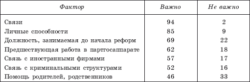 Логика экспертных оценок происхождения богатства находит свое продолжение и в ответах на вопрос о степени самостоятельности достижения людьми своего богатства. Так, более трех четвертей экспертов считает, что большинство богатых людей имели влиятельных покровителей, и еще почти две трети говорят, что они были в команде, держались своих друзей. По мнению подавляющего большинства экспертов, лишь единицы самостоятельно добились успеха и стали богатыми людьми.