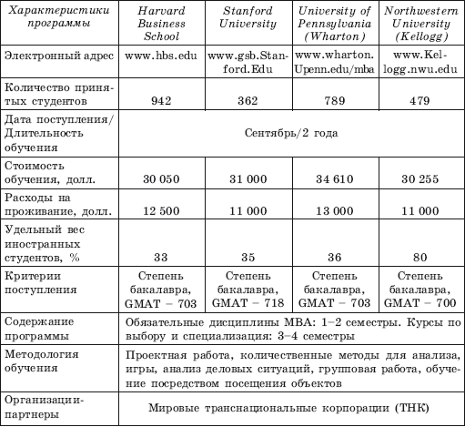 Условия программы МВА ведущих школ бизнеса США показаны в табл. 2.2.