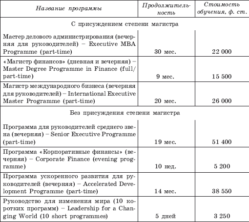 Английский опыт программы МВА. Лондонская школа бизнеса основана в 1965 г., расположена в элитном районе Лондона на Бейкер–стрит, рядом с музеем восковых фигур Мадам Тюссо и музеем Шерлока Холмса, недалеко от прекрасного Риджерс–пар–ка с озером и футбольными полями. Школе покровительствует королева Елизавета II. Здесь ежегодно обучаются более 2500 человек, из них 700–750 слушателей МВА. В школе 11 научно–учебных подразделений, библиотека, гостиница, 2 бара и ресторан, работают около 300 преподавателей и сотрудников. Основные программы и учебные дисциплины Лондонской школы бизнеса представлены в табл. 2.3.