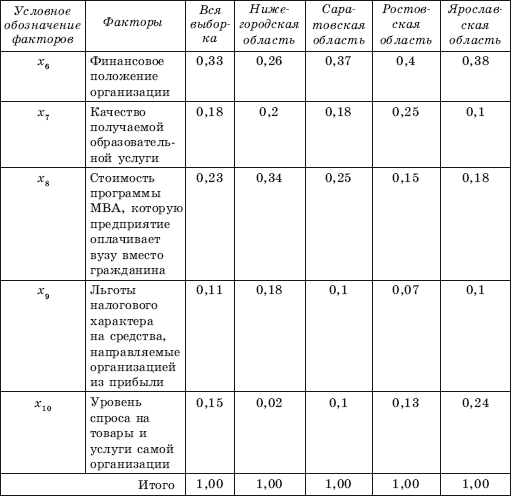 Процедура, предложенная для выявления спроса на дополнительное профессиональное образование руководителей со стороны граждан, полностью подходит для определения спроса на образовательные услуги по программе МВА со стороны предприятий. В опросе участвовало 28 экспертов, среди них 3 директора по персоналу крупных предприятий и 25 специалистов отделов персонала организаций Нижегородской, Саратовской, Ростовской, Кировской областей. Анкета включала: дату заполнения анкеты и наименование предприятия, форму собственности; перечень вопросов, выявляющих образовательные потребности. Были определены факторы, влияющие на спрос со стороны предприятий на образовательные услуги по программе МВА (табл. 4.5).
