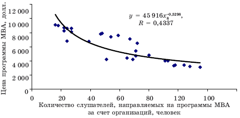 Определено, что наиболее значимым фактором, влияющим на спрос дополнительного профессионального образования по программе МВА в регионах со стороны предприятий и организаций, является их финансовое положение. В результате исследования определена зависимость количества руководителей высшего и среднего звена управления, обучаемых по программе МВА за счет предприятий и организаций регионов, от цены программы (рис. 4.5):