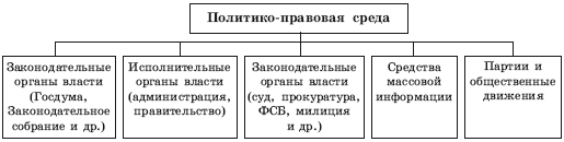 Политико–правовая среда. Маркетинговые решения, принимаемые образовательным учреждением, находятся под значительным влиянием событий, происходящих в политической и законодательной областях (рис. 5.2).